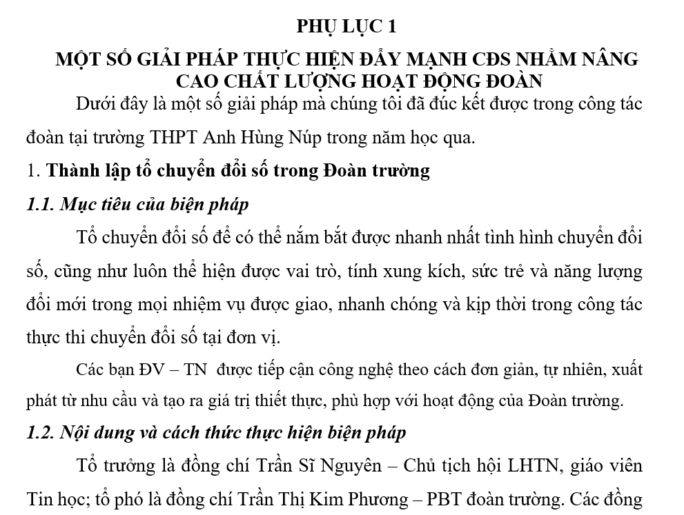 Chúng tôi là những cán bộ đoàn, nhận thức được tầm quan trọng của việc đẩy mạnh CĐS trong nâng cao chất lượng hoạt động Đoàn. Từ đó, chúng tôi mạnh dạn đề xuất một số giải pháp khi áp dụng CĐS vào hoạt động Đoàn với tên đề tài khoa học sư phạm ứng dụng, đó là ”Đẩy mạnh chuyển đổi số nhằm nâng cao chất lượng hoạt động Đoàn tại trường THPT Anh Hùng Núp”.